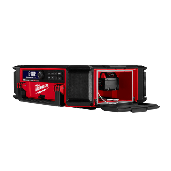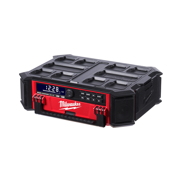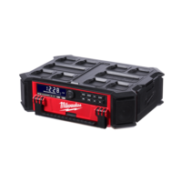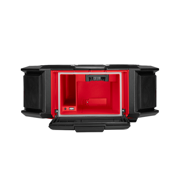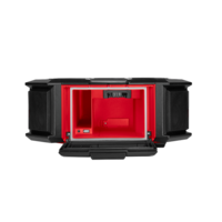 The M18 PACKOUT Radio + Charger is the ultimate jobsite sound system, and is fully compatible with all PACKOUT Modular Storage System solutions. This 10 speaker sound system delivers the user and the jobsite with 360° sound. The Milwaukee M18 PACKOUT Radio + Charger delivers full range connectivity with Bluetooth 4.2, an auxiliary input, and an AM/FM radio. The Bluetooth speaker also features a built-in M18™ charger. This heavy duty jobsite radio has a 2.1A USB output to keep M18 REDLITHIUM-ION batteries, and mobile devices charged all day long.