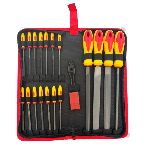 The File Set Includes 4 x 200mm Files (Flat / Triangular / Half-Round / Round) & a selection of 14 Needle Files (Flat / Triangular / Half-Round / Round) with either a straight blade or tapered.