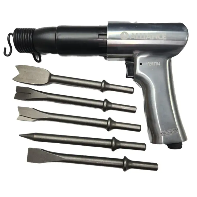 Heavy-duty air hammer supplied with 5 chisels. Applications are the same as AL-4200 but have a greater capacity. Takes AA-5001 quick change chisel retainer and AA-5000 needle scaler attachment for weld dressing.
