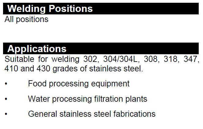- Suitable for a range of Stainless steel including: 302, 304, 308, 316, 318, 347, 410 and 410