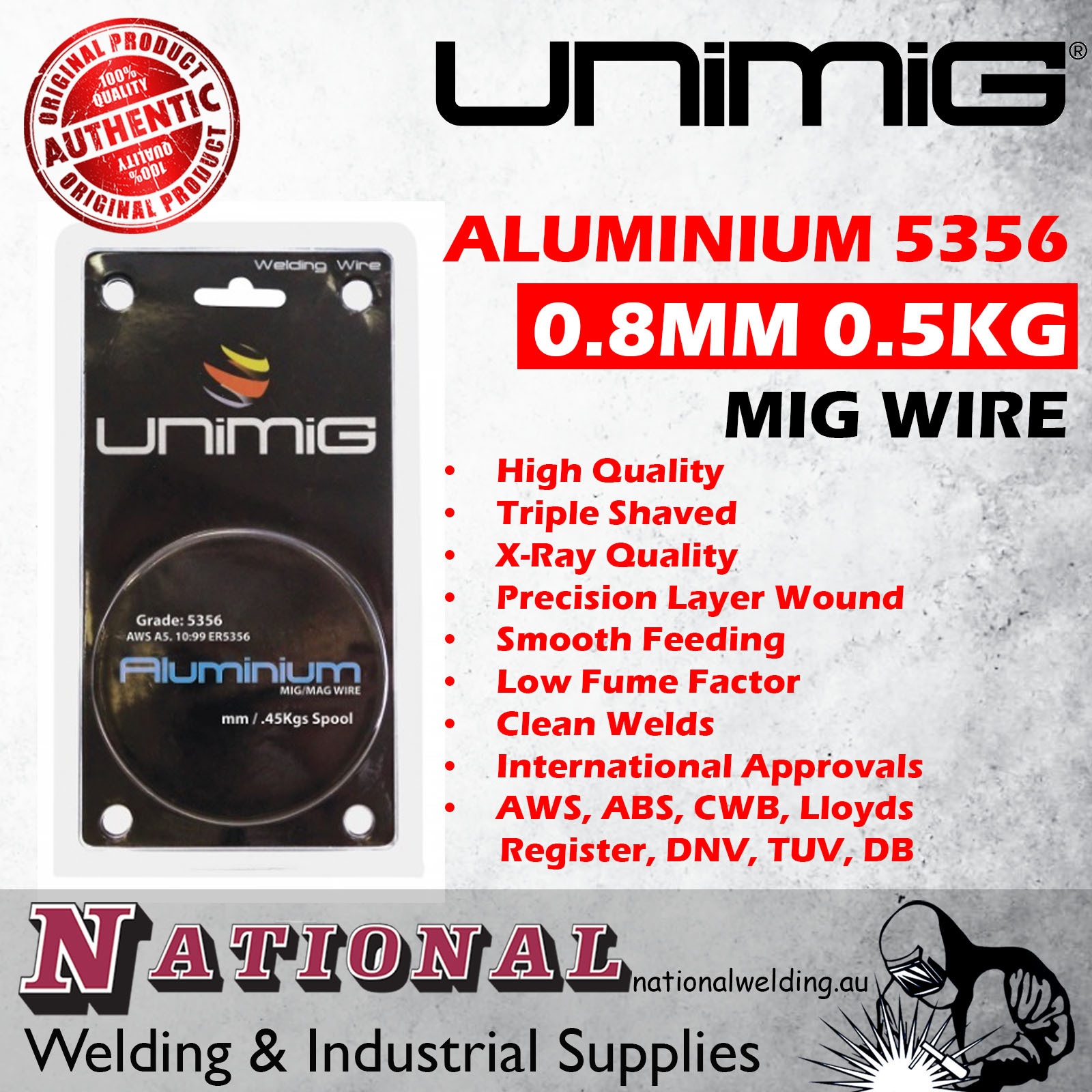 UNIMIG 5356 is the highest quality consistent aluminium welding wire available anywhere in the world. Because our manufacturer is the only one in the world that melts and casts their own redraw rod and they have complete control of the manufacturing process allowing them to tightly control and refine the alloys’ chemical composition to exacting tolerances, this ensures premium quality aluminium wire products and outstanding welding performance.