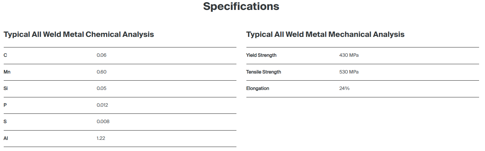 The Austfil T-11 is a self-shielded flux cored MIG wire for single and multi pass applications in all positions. Arc is smooth and soft, good welding performance, full slag covering and easy slag removal.