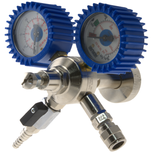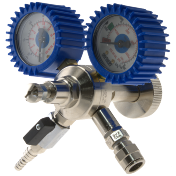 This compact regulator is specifically designed for small beer dispensing systems using CO2 and CO2 /N2 mixtures. A specially designed inlet uses a hand wheel that seals easily on an “O” ring and a safety relief valve is fitted to the downstream low pressure side. It has high and low pressure gauges and in addition is fitted with an isolation and check valve on the outlet, which also features a multiple size hose barb.