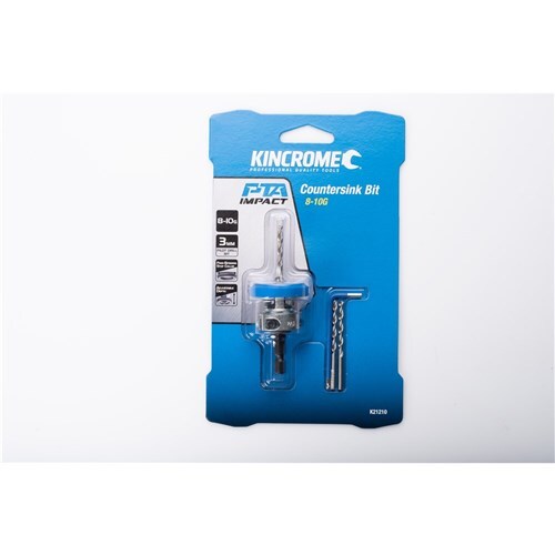 Introducing the latest addition to the Kincrome PTA Impact range, PTA Countersink bits. Kincrome countersink bits pilot drill and countersink holes in one simple step. Designed for decking and wood-working applications, the tool features a depth adjustable free spinning stop collar to protect the work surface and ensure consistent countersink depth, anti-clog debris cavities and replaceable parabolic high-speed steel (HSS) pilot drill bits. Both sizes come with 2 spare drill bits and a hex key for easy changing of bits. The 8-10G Countersink bit is suitable for 8-10 gauge screws and 3.0mm spare pilot drill bits are available.