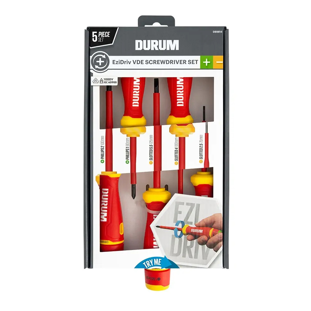 The Durum EziDriv VDE Screwdriver set is VDE certified for use up to 1000V. Every VDE screwdriver is quality tested to ensure they meet or exceed DIN EN IEC 60900 standard.The Durum EziDriv system gives the user more control, making it much easier to drive screws one-handed. The handle is ergonomically shaped to allow maximum leverage, as well as precision fingertip turning.