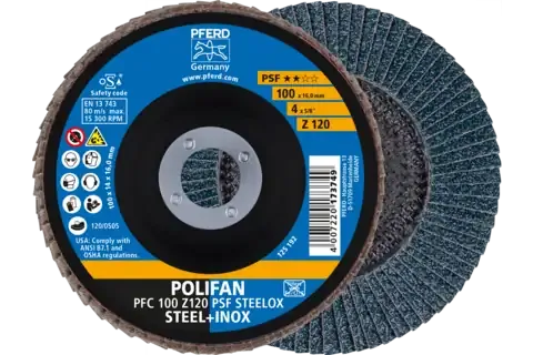 POLIFAN flap disc for steel and stainless steel (INOX) with aggressive stock removal rate and good tool life.