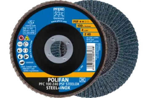 POLIFAN flap disc for steel and stainless steel (INOX) with aggressive stock removal rate and good tool life.