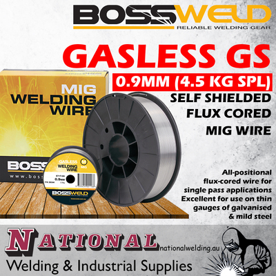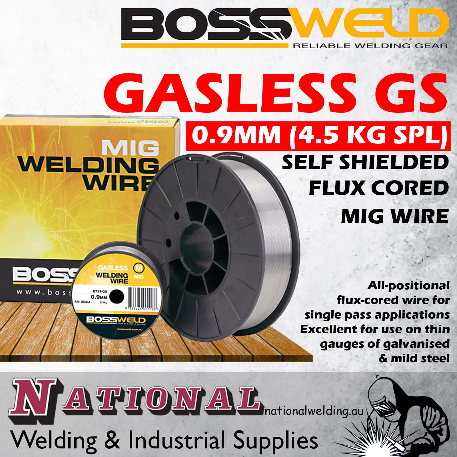 The Bossweld Gasless GS Self Shield MIG Wire is a self-shielding, all-positional flux-cored wire for single pass applications. Excellent for use on thin gauges of galvanised & mild steel. Travel speed is high & weld edges are smooth. It has a smooth arc action, full slag coverage, easy slag removal & low spatter. No shielding gas is required. The use of DC straight polarity welding current minimises the risk of burn through. Deposition efficiency is higher than that of shielded metal arc electrodes.