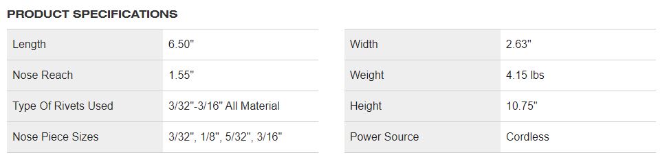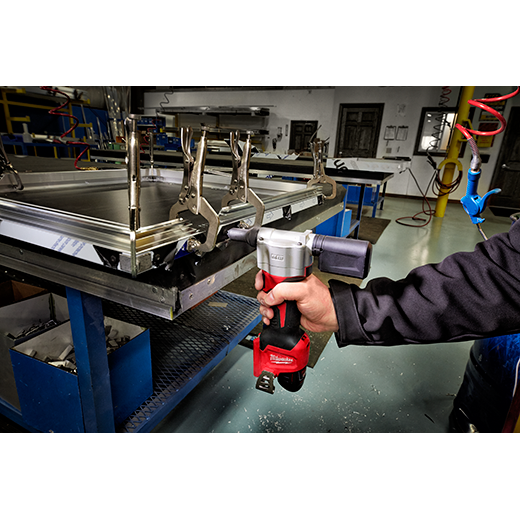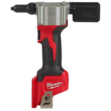 The M12™ Rivet Tool is the first cordless solution that delivers fast, easy riveting while maintaining performance, durability, and size. The 2550 can pull up to 250 3/16" stainless steel rivets or 450 1/8" steel rivets on one charge with a 1.5ah battery, and reduces muscle effort from a hand tool by 60%. No compressors or hoses during set up and operation makes this tool a great replacement to pneumatic products. 2X longer life over current cordless solutions delivers greater durability from common jobsite conditions and use. This is the most compact cordless rivet tool on the market, measuring only 6.5” in length allowing users more access in tight spaces. The M12™ Rivet Tool is part of the M12™ battery platform, offering 90+ solutions on one battery system.