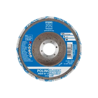 POLINOX unitized discs are used for face-down grinding on speed-adjustable angle grinders. Especially well-suited to work on larger surfaces. The compressed, non-woven material is bonded to a glass-fabric base.
