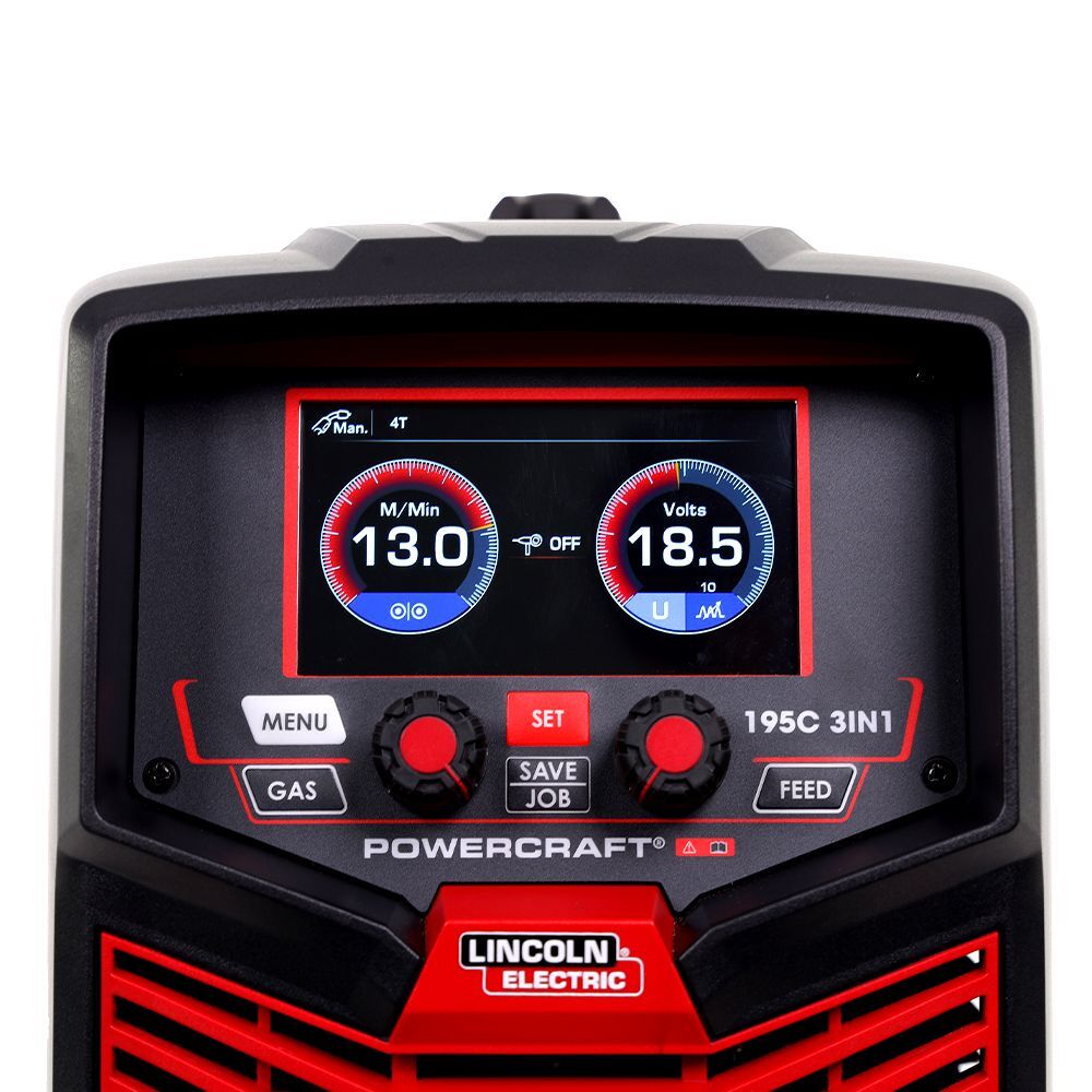 The Lincoln Electric K69114-1 PowerCraft 195C is a compact and portable 3-in-1 multi-process welder, offering MIG, Stick, and lift TIG capabilities with a 195A output on a standard 10A supply. Featuring improved EZYSET synergic technology, pulse functionality, and a large full-colour LCD, it's designed for ease of use and fast setup with quick cable connections and built-in VRD. Weighing just 14kg and certified to AS/NZ60974-1 Standards, it's ideal for light fabrication, maintenance, and DIY work, and is backed by a 3-year Lincoln Electric warranty.