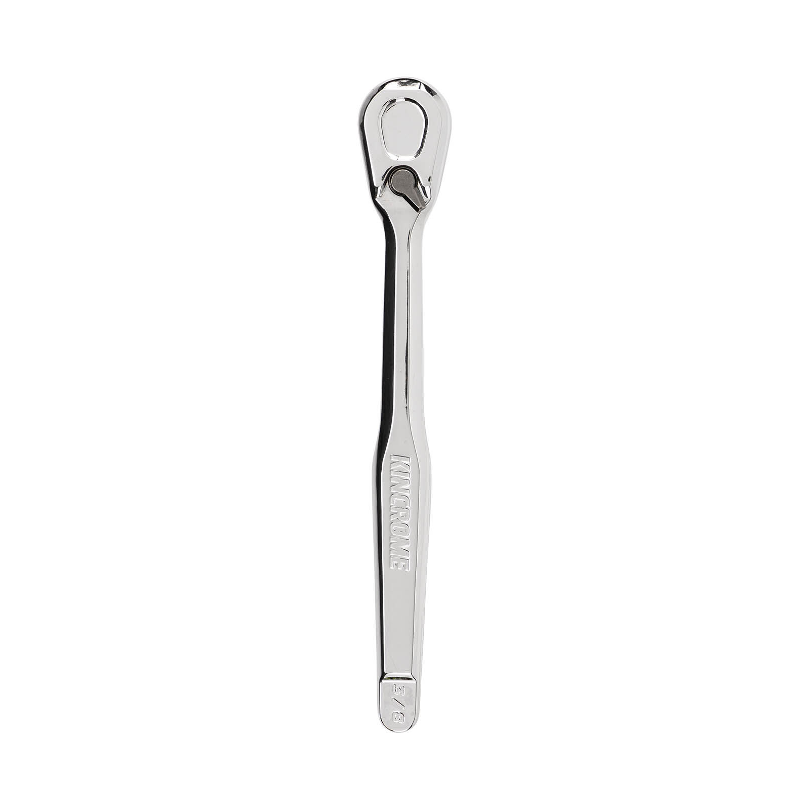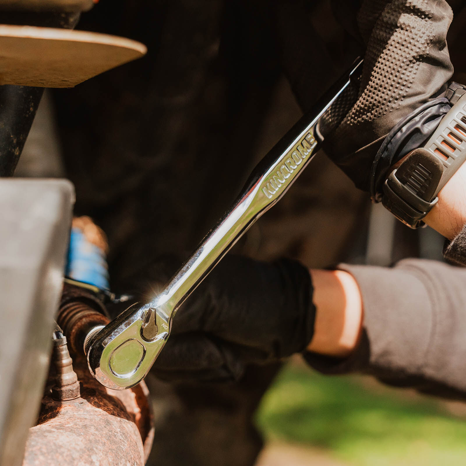 Discover Kincrome’s exclusive, 100% Australian-designed ratchet range—unique to Kincrome and the Australian market—crafted from premium Chrome Vanadium steel with a sleek Chrome Mirror finish and featuring an upgraded 90-tooth ratcheting mechanism for ultra-fine 4° swing adjustments; choose between quick-release button or sealed head designs, benefit from easy end-stop drive-size stamping for instant identification, and find the perfect fit in stubby, standard, long, or extra-long lengths; experience superior ergonomics with the CHOKE GROOVE head for improved grip and a longer swept-handle design for greater leverage, all engineered to meet and exceed DIN standards and proudly designed in Australia for Australian professionals.