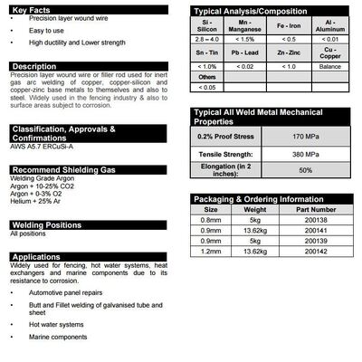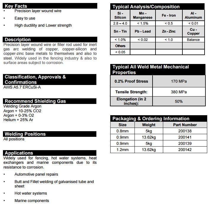 Premium quality silicon bronze filler rod gives excellent joints on copper to silicon & copper to zinc base metals & to steel. Also used in the hot water & marine industries due to its tensile strength & superior resistance to corrosion. (Cusilman 801).