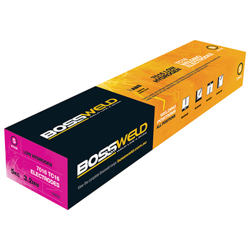 The Bossweld TC16 hydrogen controlled, twin coated electrode recommended for welding high tensile steels, including the repair of earth moving equipment. The TC16 has an extremely stable arc and is more tolerant to rust or paint on the work surface.