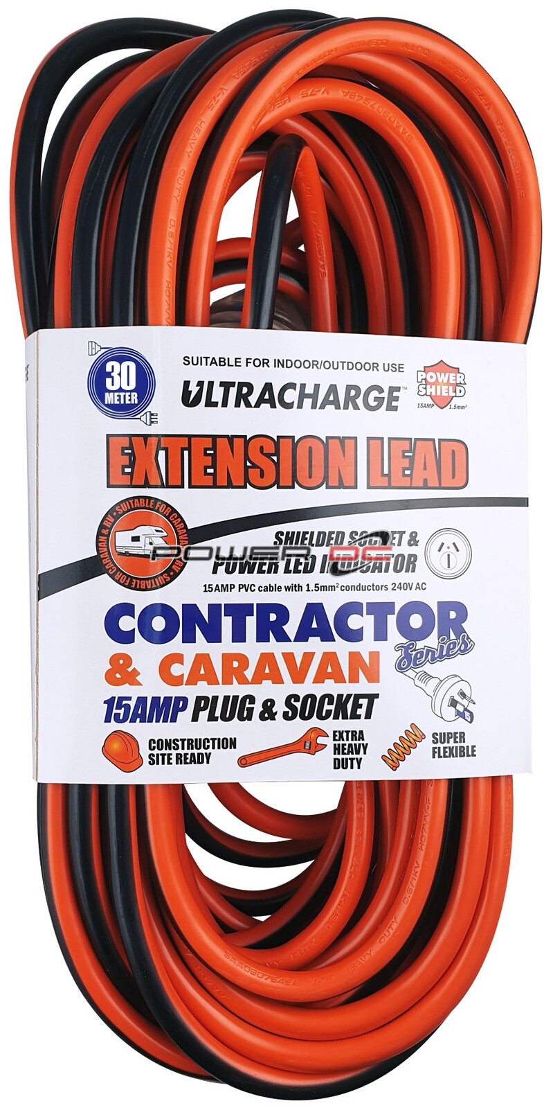 ULTRACHARGE CONTRACTOR/CARAVAN SUITABILITY LEAD 30M 15A This heavy duty mains 30m extension lead features a 15A plug and socket used for 15 amp connections. This is commonly required for connecting Caravans and other RVs to mains connections in Caravan Parks. The extension lead features a thick orange/black flexible chord and an internal LED to indicate that live power. Specifications: Length: 30m Voltage: 240V Max Current: 15A Max Power: 3600W