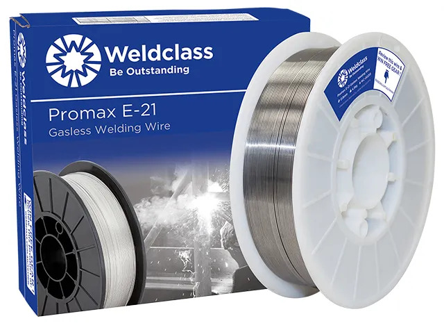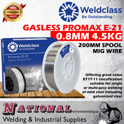 PROMAX E-21 is an industrial grade Gasless (self-shielded) 'MIG' welding wire offering great value. E71T-11 classification, suitable for single or multi-pass welding of mild steel including galvanized steel.