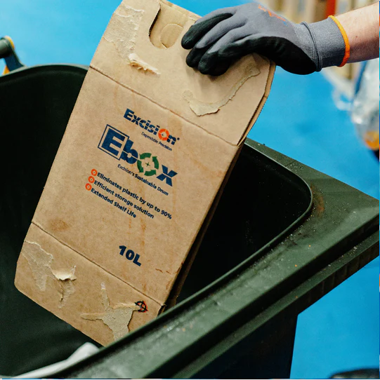 The Excision Ebox is a hassle-free way to store and dispense oil and metalworking fluids. Its square shape and built-in handle make it easy to store and carry, while its fully sealed interior ensures the oil is always protected from contaminants. Disposal is hassle-free with the cardboard box, making it easy to take apart and recycle, with the plastic reduction cutting landfill by up to 90%.*
